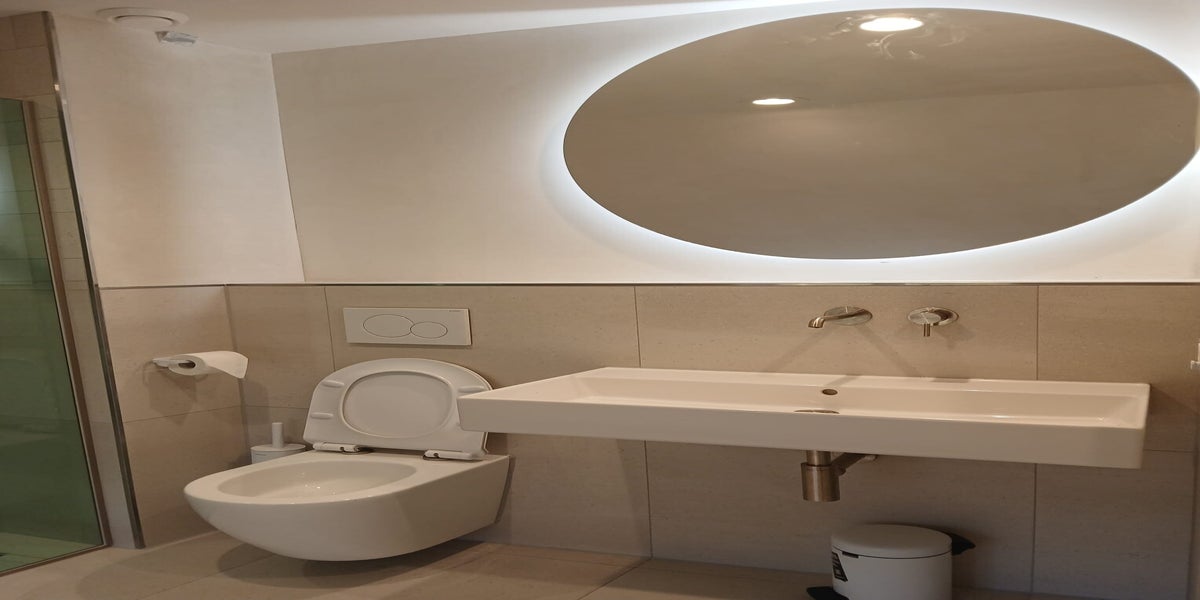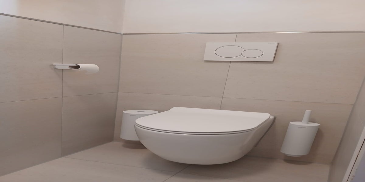 Bij de renovatie hebben we gekozen voor een stijl die zowel eigentijds als fris oogt. De basis van de badkamer en het toilet bestaat uit rustige tegels die een kalmerende uitstraling geven. Dit zorgt voor een harmonieuze sfeer die bezoekers uitnodigt tot ontspanning.