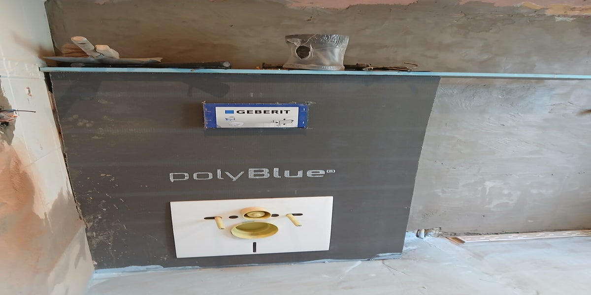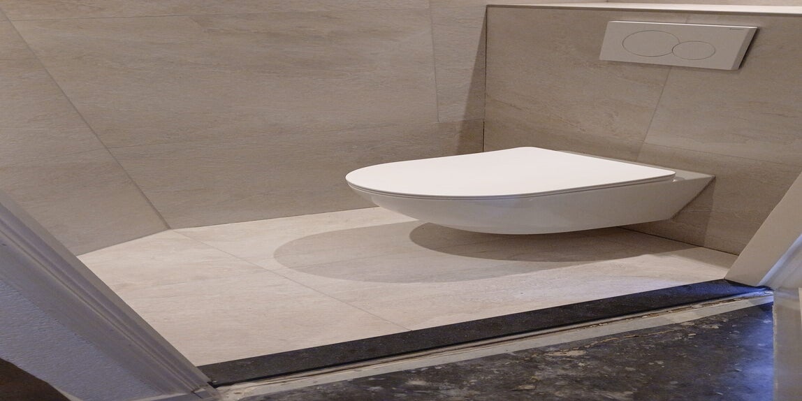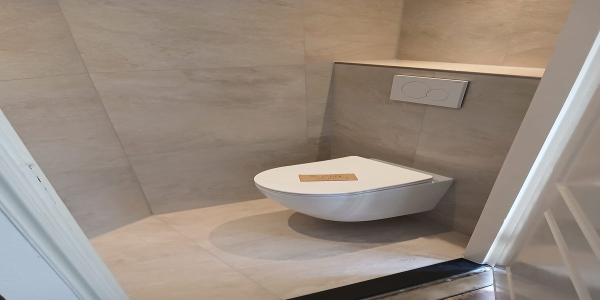 Het nieuwe toilet is vakkundig aangesloten en goed vastgezet, zoals het hoort.