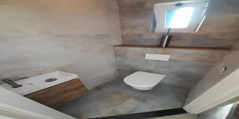 Na het leggen van de vloertegels, is het toilet aan de beurt. Deze ruimte wordt helemaal aangepakt: van het installatie- en tegelwerk tot het netjes afmonteren van de nieuwe elementen. Het toilet wordt een functionele en mooie ruimte die perfect past bij de vernieuwde benedenverdieping.
