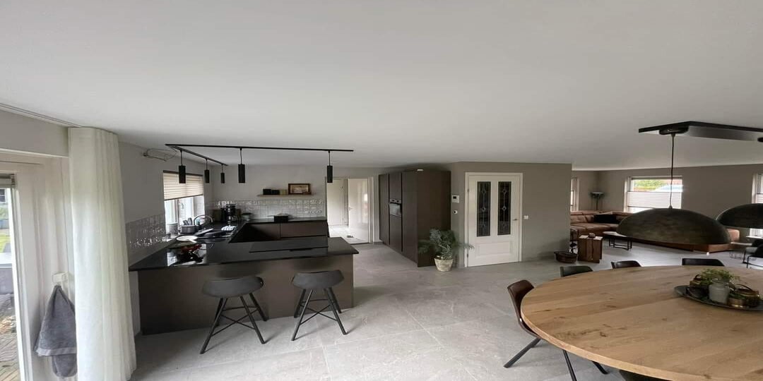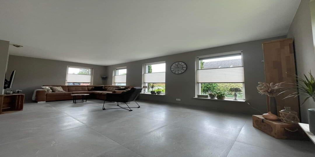 De hele benedenverdieping van deze woning krijgt een strakke tegelvloer. De klant heeft gekozen voor een grote tegel van 90x90 cm. Deze grote, lichte tegels zorgen ervoor dat de ruimte groter lijkt en de woning een frisse uitstraling heeft. Het resultaat is een moderne en tijdloze vloer die bijdraagt aan het woonplezier.